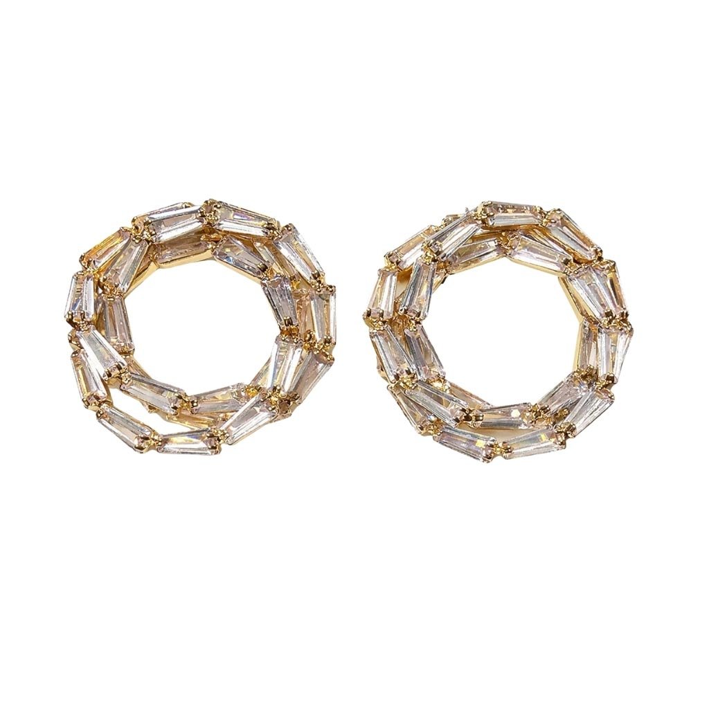 Apskritimo formos auskarai, kuriuose auksinė spalva subtiliai persipina su skaidriais akmenukais. Elegantiškas ir laikui nepavaldus aksesuaras.