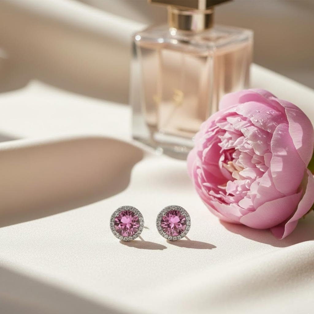 Klasikiniai sidabro spalvos auskariukai su rausvu akmenuku, spinduliuojantys švelnią prabangą. Tvarkingas vinuko dizainas užtikrina patogumą, o rausvas akmuo suteikia šilumos ir moteriškumo.