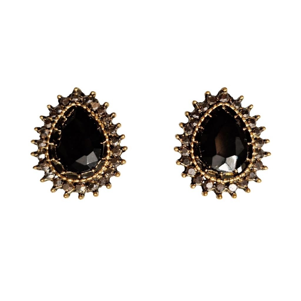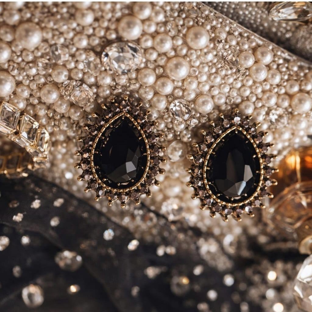 Išskirtiniai lašo formos auskarai, kuriuose juodas akmuo tampa pagrindiniu akcentu, o antracito atspalvio metalas su žėrinčiais akmenukais sukuria prabangų ir modernų įvaizdį.