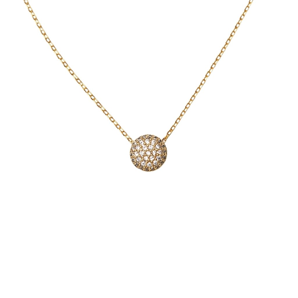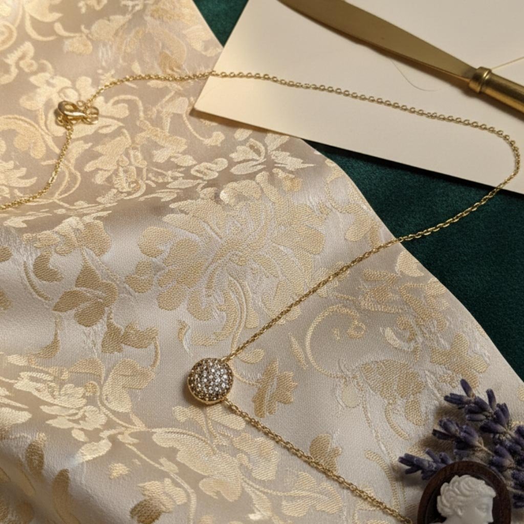 Elegantiška aukso spalvos grandinėlė su mažyčiu pakabuku, primenančiu dekoratyvinę pagalvėlę. Pakabukas gausiai puoštas smulkiais akmenukais, kurie subtiliai žėri ir suteikia papuošalui švelnios prabangos. Dėl savo mažo dydžio ir rafinuoto dizaino, grandinėlė puikiai tinka kasdienai, bet taip pat puikiai papuošia ir vakarinius derinius. Tai švelnus, moteriškas akcentas, kuris prideda žavesio kiekvienai šukuosenai ir įvaizdžiui.