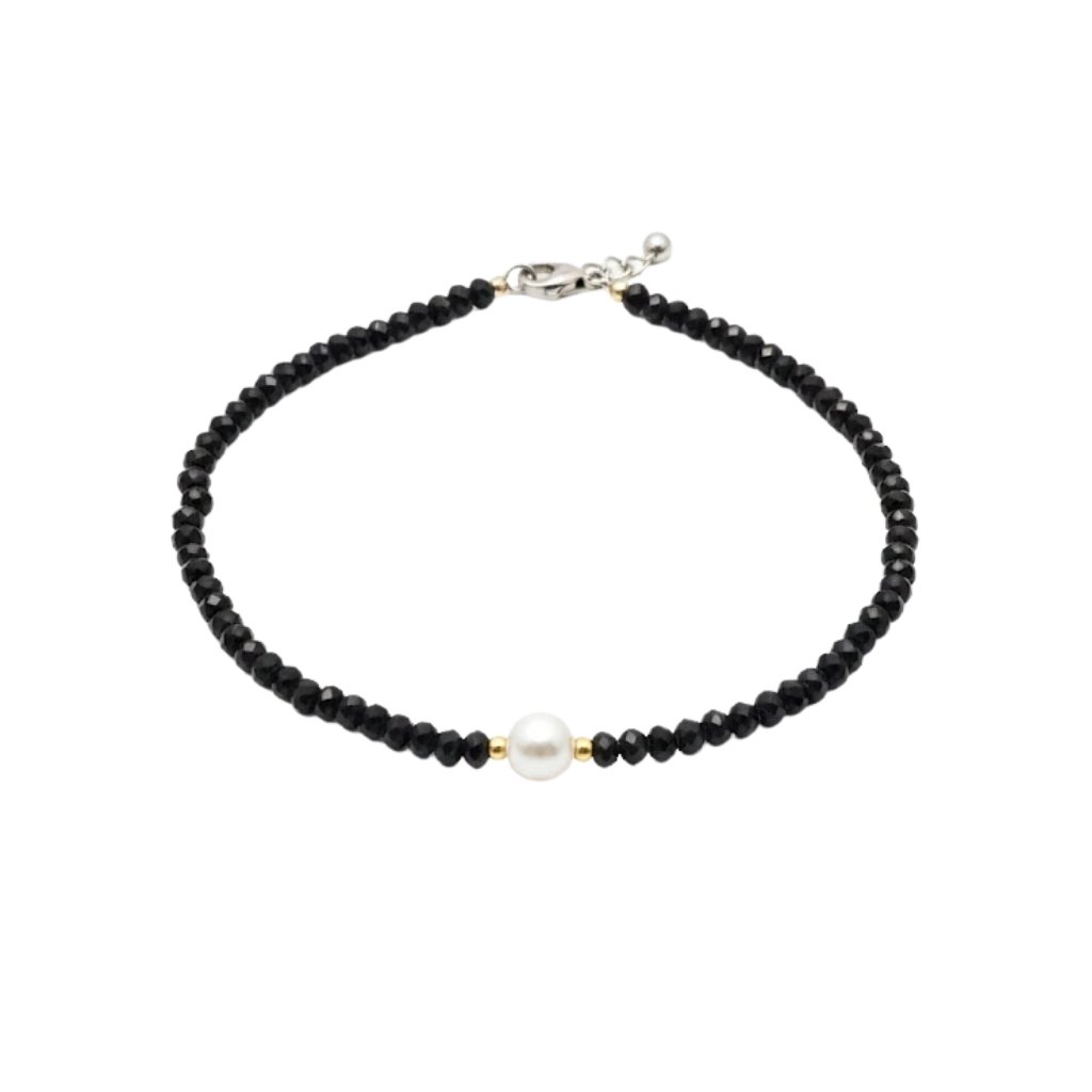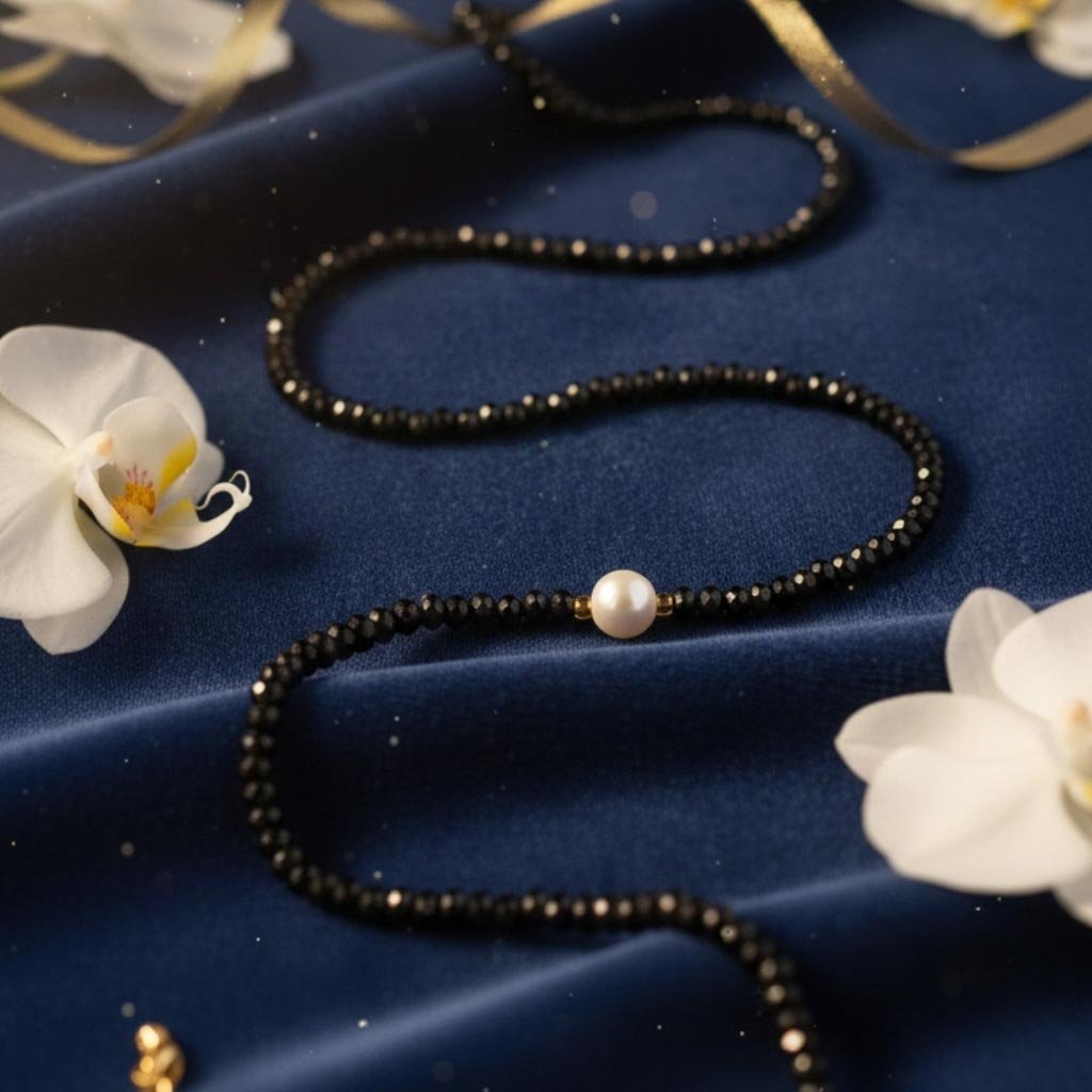 Elegantiška grandinėlė iš juodų akmenukų, puošta vienu subtiliu perlu. Perlas – švelnus ir moteriškas akcentas, suteikiantis papuošalui prabangos ir šviesos, o juodi akmenukai kuria modernų kontrastą ir išskirtinį charakterį. Minimalistinis dizainas pabrėžia perlo grožį, todėl grandinėlė tinka tiek kasdienai, tiek ypatingoms progoms.