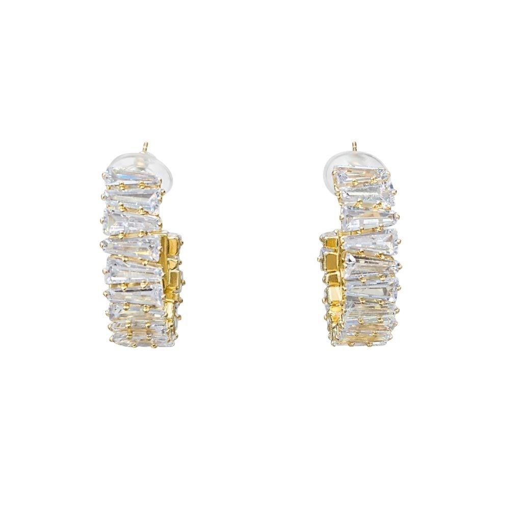 Prabangūs vakariniai pusmėnulio formos auskarai, aukso spalvos su skaidriai žėrinčiais akmenukais – išskirtinis akcentas, kuris akimirksniu pakylės Jūsų įvaizdį.