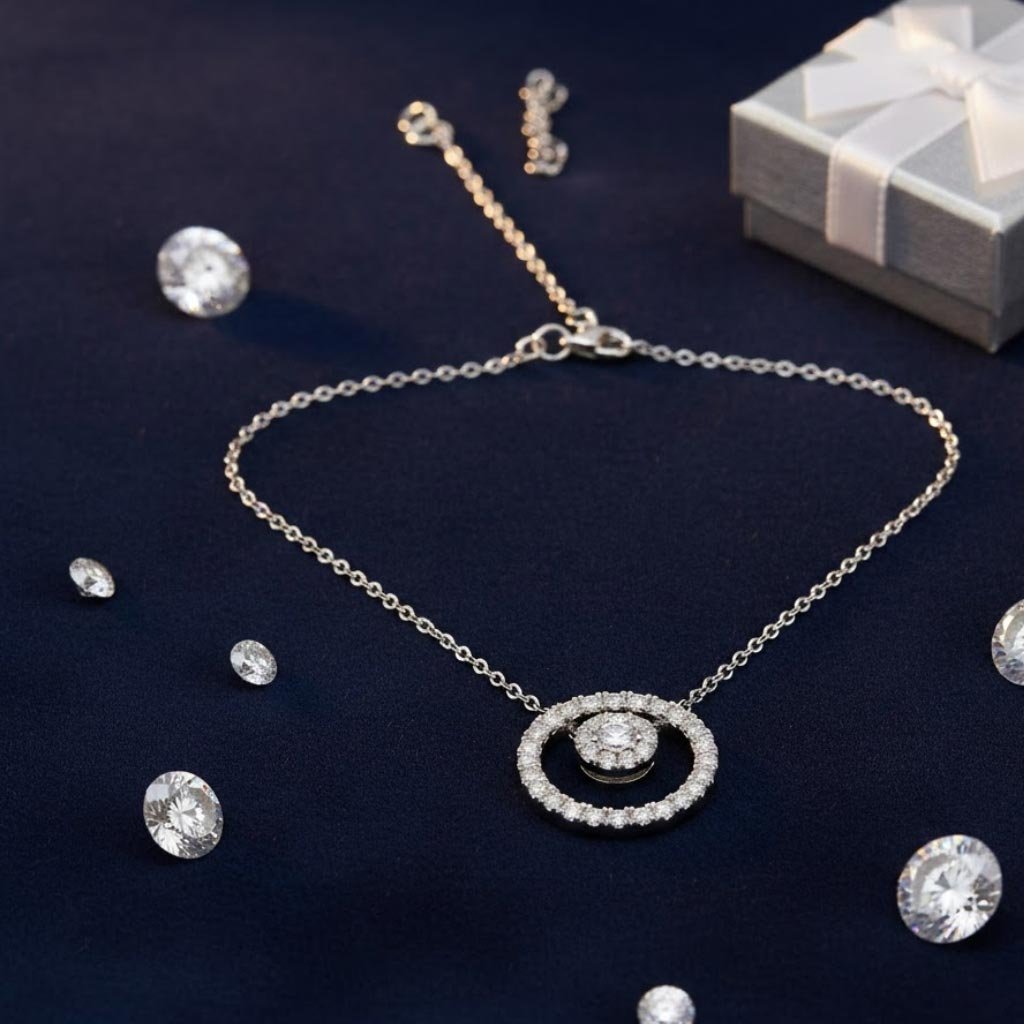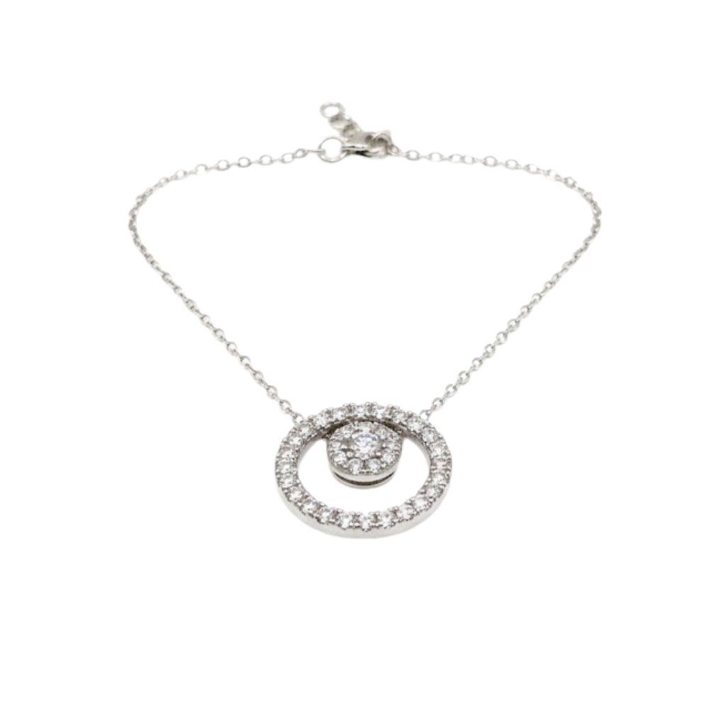 Elegantiškas dvigubo apskritimo formos pakabukas, kurio minimalistinį dizainą papildo žerintys akmenukai. Šis pakabukas suteiki prabangų įvaizdį kievieną dieną.